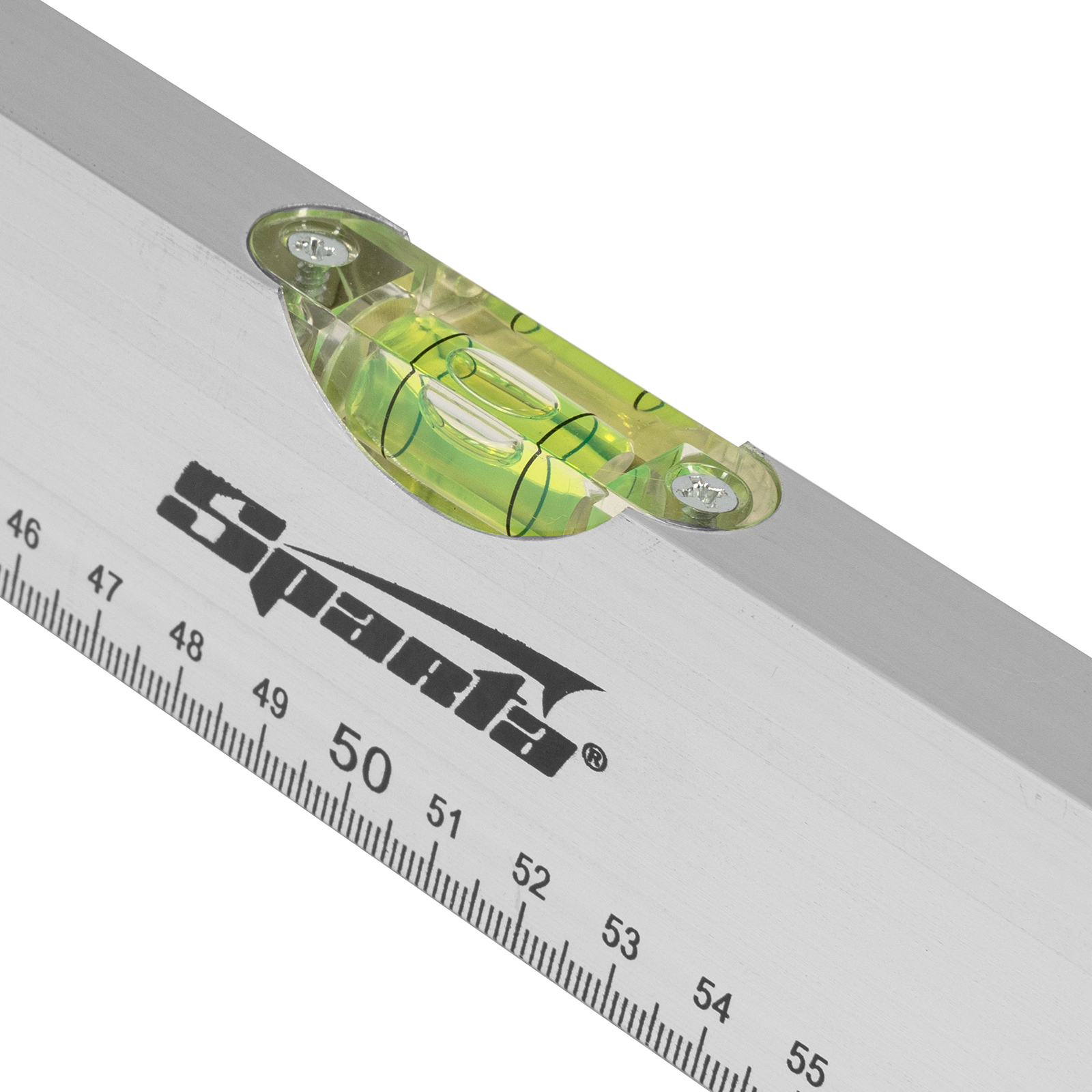Алюминиевый уровень Sparta 35110 длиной 1000 мм, с 2 глазками и линейкой, рассчитан на применение в быту и в производственных условиях. Он поможет добиться точного выстраивания разметочных линий для последующей установки конструкций, полок, укладки облицовочных материалов и т.д. Две пузырьковые ампулы обеспечивают точный контроль отклонений поверхностей от горизонтальной и вертикальной плоскостей.,Для определения отклонения вертикали 90 градусов необходимо использовать пузырьковую ампулу только в верхнем положении уровня. Только базовая поверхность является рабочей (противоположная ампуле 180 градусов).