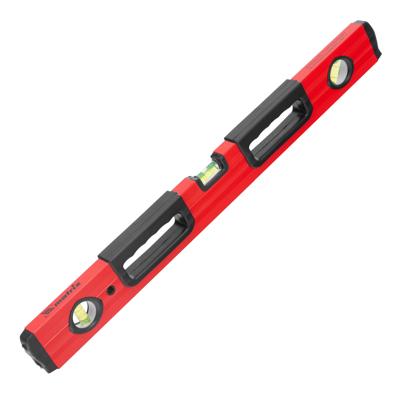 Фрезерованный алюминиевый уровень Matrix 33221 длиной 600 мм, с 3 глазками и 2 эргономичными ручками, поможет проверить горизонтальные и вертикальные поверхности, выставить угол 45 градусов. Он будет полезен на любом этапе строительства и ремонта: при облицовке и отделке поверхностей, монтаже конструкций и т.д. Погрешность измерений на метр не превышает 1 мм (0,057 градуса).,Для определения отклонения вертикали 90 градусов необходимо использовать пузырьковую ампулу только в верхнем положении уровня. Только базовая поверхность является рабочей (противоположная ампуле 180 градусов).