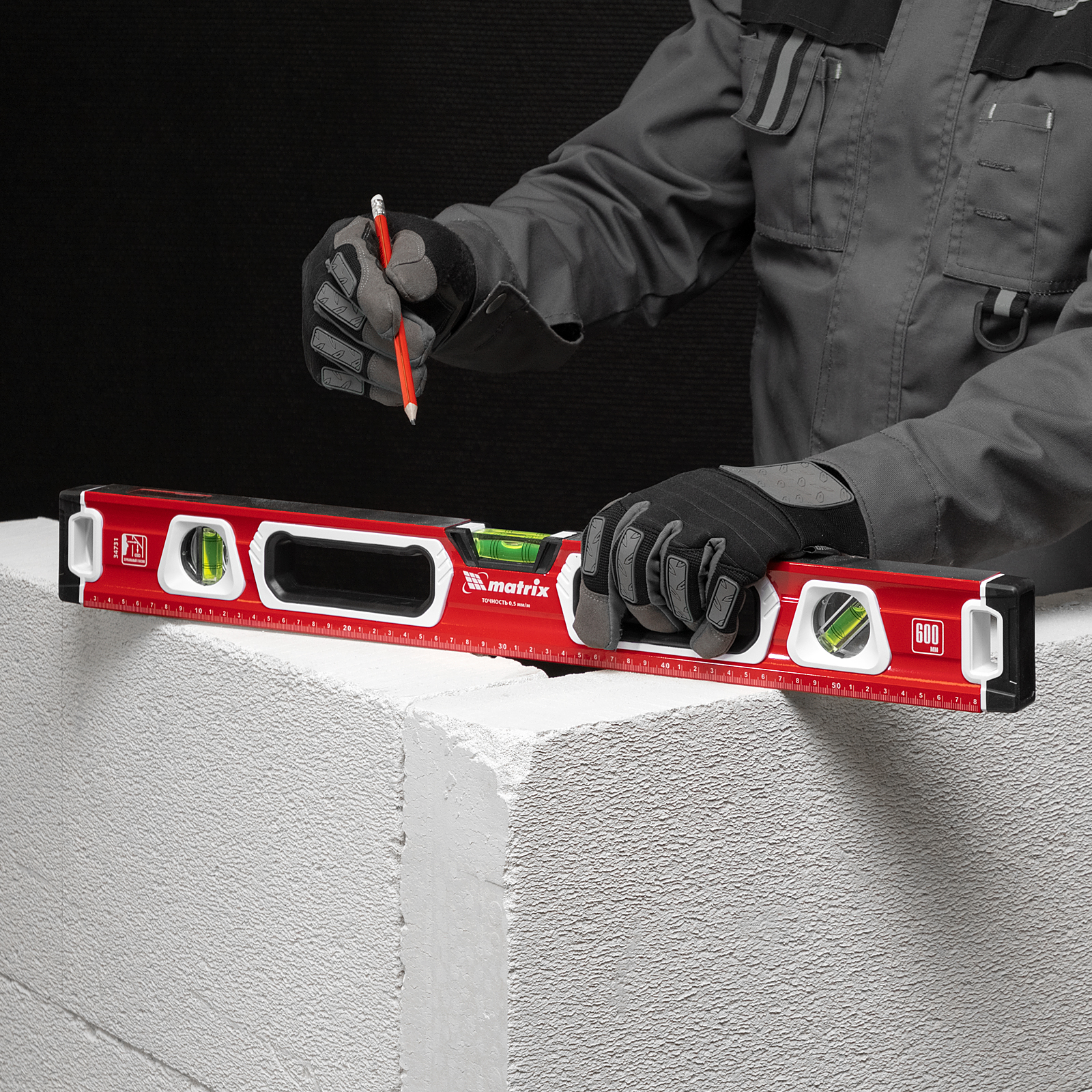 Алюминиевый уровень Matrix 34731 длиной 600 мм, магнитный, фрезерованный, с двухкомпонентными рукоятками, 3 глазками и 1 зеркальным отражателем, относится к категории измерительных инструментов. Служит для контроля отклонений поверхностей от горизонтали, вертикали и угла 45 градусов. Инструмент понадобится при осуществлении работ, требующих высокой точности.,Для определения отклонения вертикали 90 градусов необходимо использовать пузырьковую ампулу только в верхнем положении уровня. Только базовая поверхность является рабочей (противоположная ампуле 180 градусов).