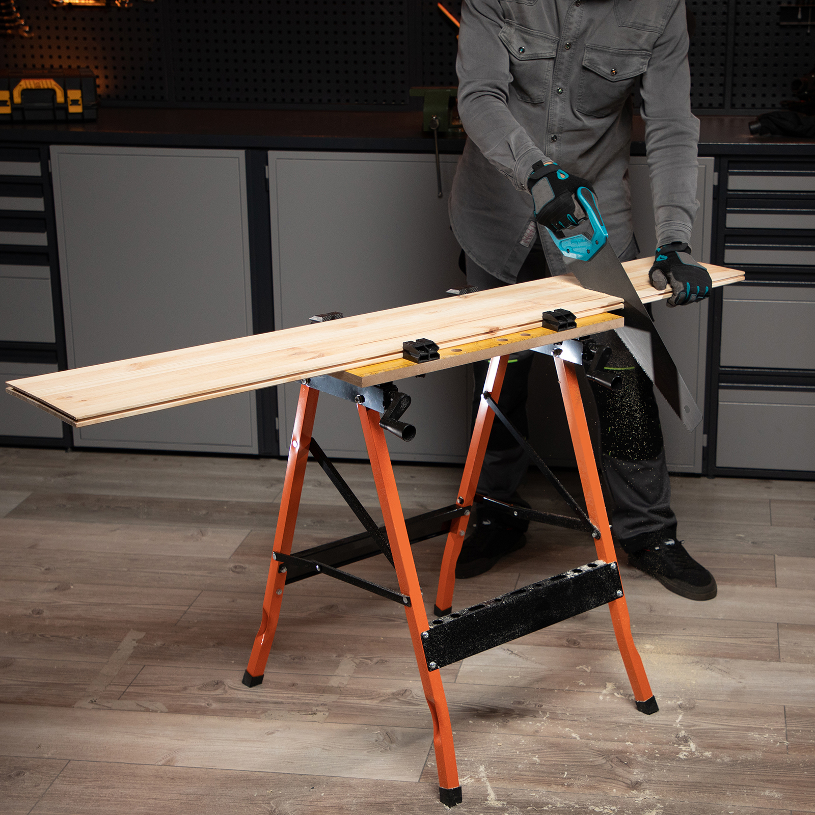 - Компактность — в сложенном виде верстак занимает мало места, его можно хранить без снятия элементов конструкции.