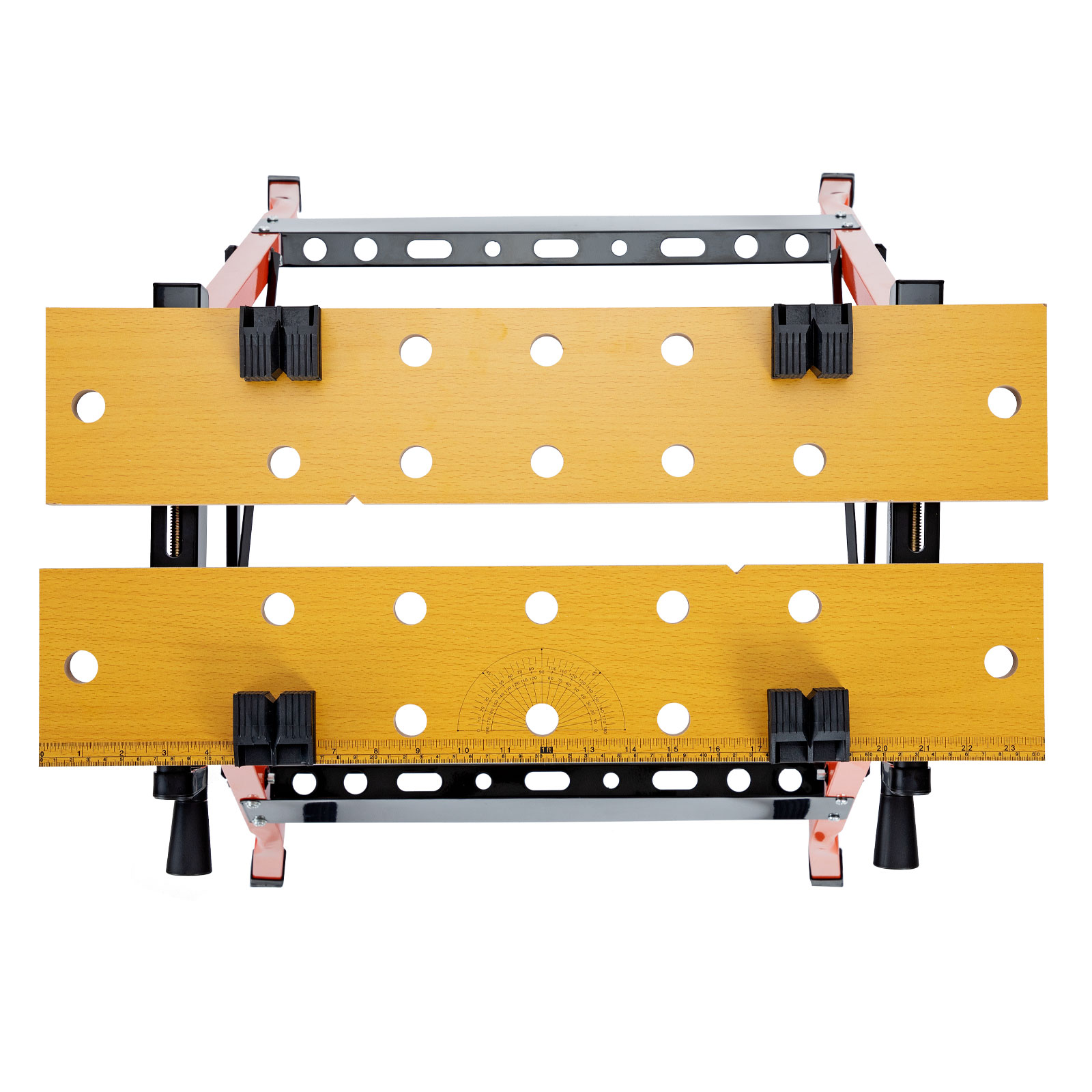- Удобная эксплуатация — верстак снабжен 4 съемными упорами, которые устанавливаются в различных позициях, а на столешнице имеется разметка с линейкой и транспортиром.