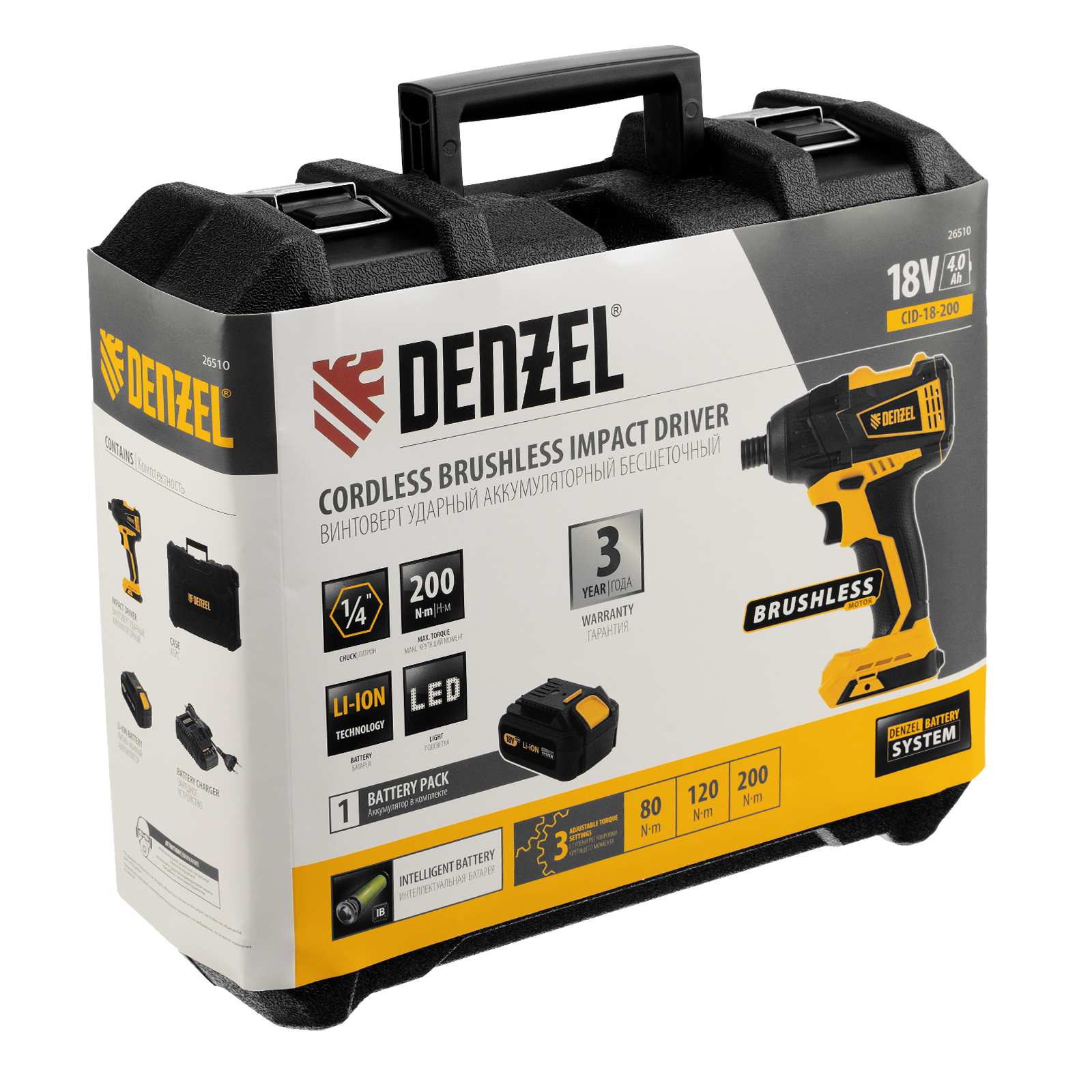 Ударный аккумуляторный винтоверт Denzel CID-IB-200 26510 с бесщеточным двигателем работает от батареи Li-Ion с рабочим напряжением 18 В и предназначен для завинчивания и отвинчивания винтов и шурупов, а также затягивания и откручивания гаек. Эффективен для демонтажа перетянутого и закисшего крепежа, закручивания длинных болтов и шурупов. Пригодится для сборки мебели и различных конструкций.,Аккумуляторный винтоверт не зависит от стационарного источника энергии. Интеллектуальная батарея емкостью 4 А/ч с защитой от перезаряда и глубокого разряда не имеет эффекта памяти, благодаря чему обеспечивает стабильную работу инструмента на протяжении длительного времени.