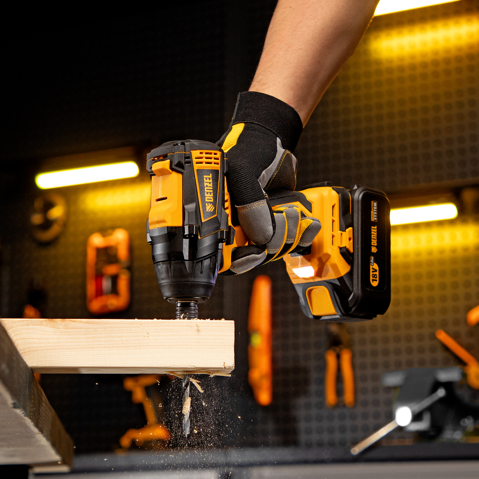- Универсальность — к инструменту подойдут любые 18 В аккумуляторы Denzel battery system