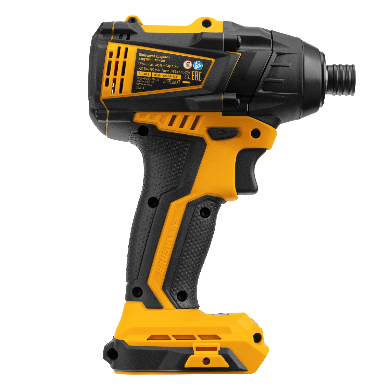 Ударный аккумуляторный винтоверт Denzel CID-IB-200-0 26511 с бесщеточным двигателем работает от аккумулятора Li-Ion с рабочим напряжением 18 В (не входит в комплект поставки) и благодаря высокому крутящему моменту 200 Нм подходит для завинчивания и отвинчивания винтов и шурупов, а также затягивания и откручивания гаек. Эффективен для демонтажа перетянутого и закисшего крепежа, закручивания длинных болтов и шурупов. Пригодится для сборки мебели и различных конструкций.,Аккумуляторный винтоверт не зависит от стационарного источника энергии. Инструмент работает на платформе 18V Denzel battery system и совместим с элементами питания 18 В.