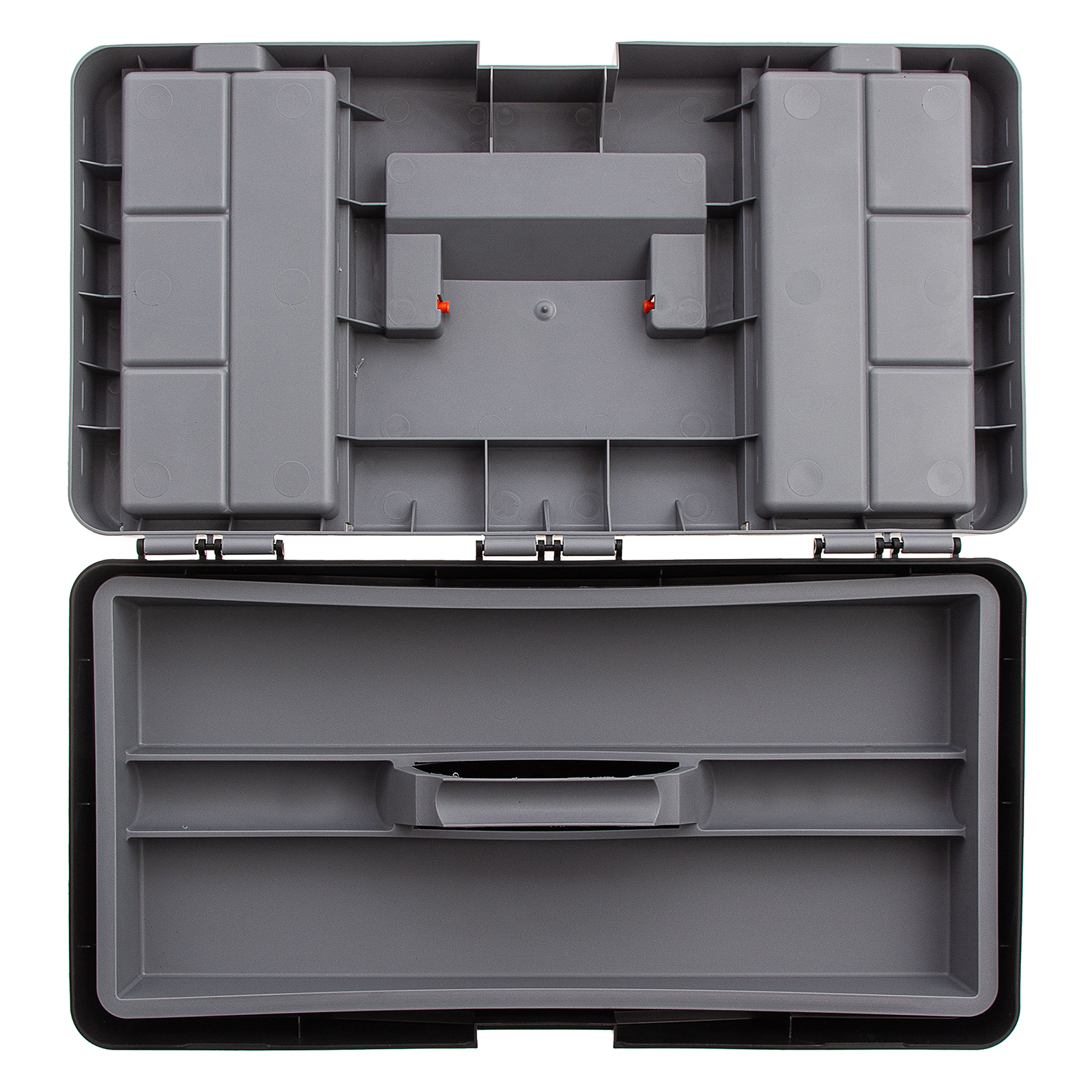 Ящик для инструмента Stels 90704 из пластика, длиной 17", габаритами 420 х 220 х 180 мм, предназначен для переноски и хранения инструментов, хозяйственных мелочей, рыболовных снастей. Крышка надежно закрывается, поэтому содержимое не рассыплется. Встроенные в крышку отделения обеспечивают быстрый доступ к крепежам и другим необходимым предметам. Большой ящик для хранения инструментов будет полезен дома, на даче, в гараже и на рыбалке.
